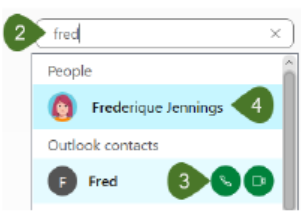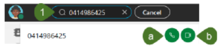 To initiate a call, click into the Search, meet and call bar at the top of the application and enter either the name of the internal user or the external number you would like to call.
