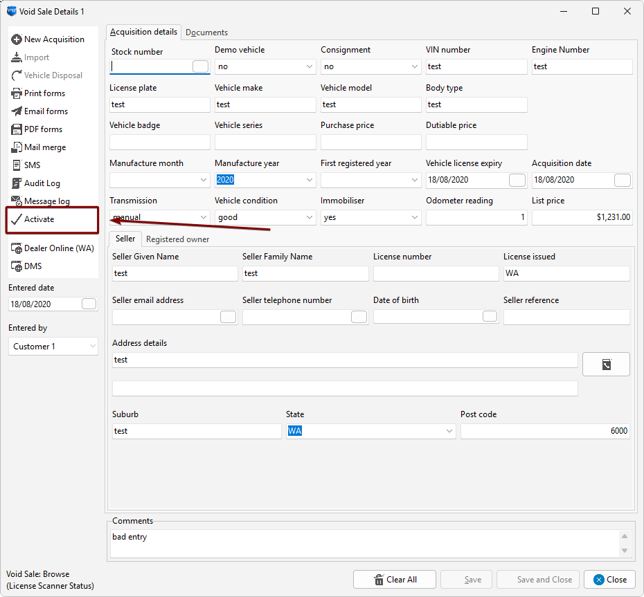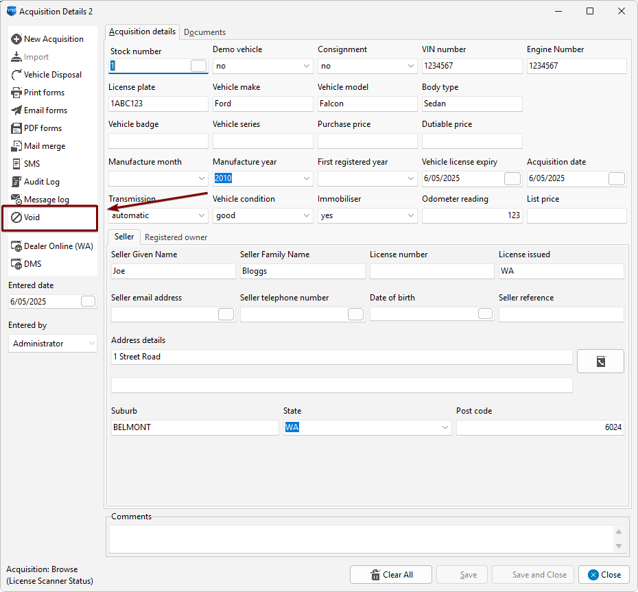 If the sale has fallen through, or if you put it in the wrong company, you can Void an acquisition. You can void an acquisition by clicking "Edit" and then clicking "Void" in the form-popup on the left-side. You will not be able to modify the voided entry unless you activate it again.