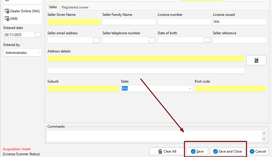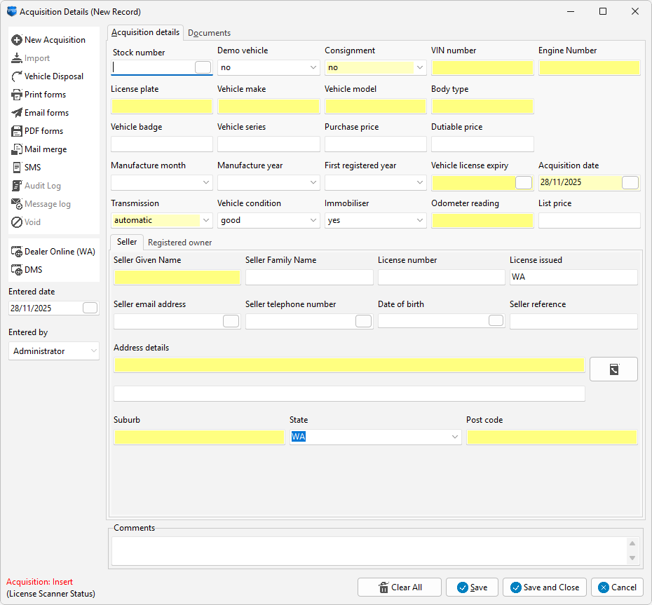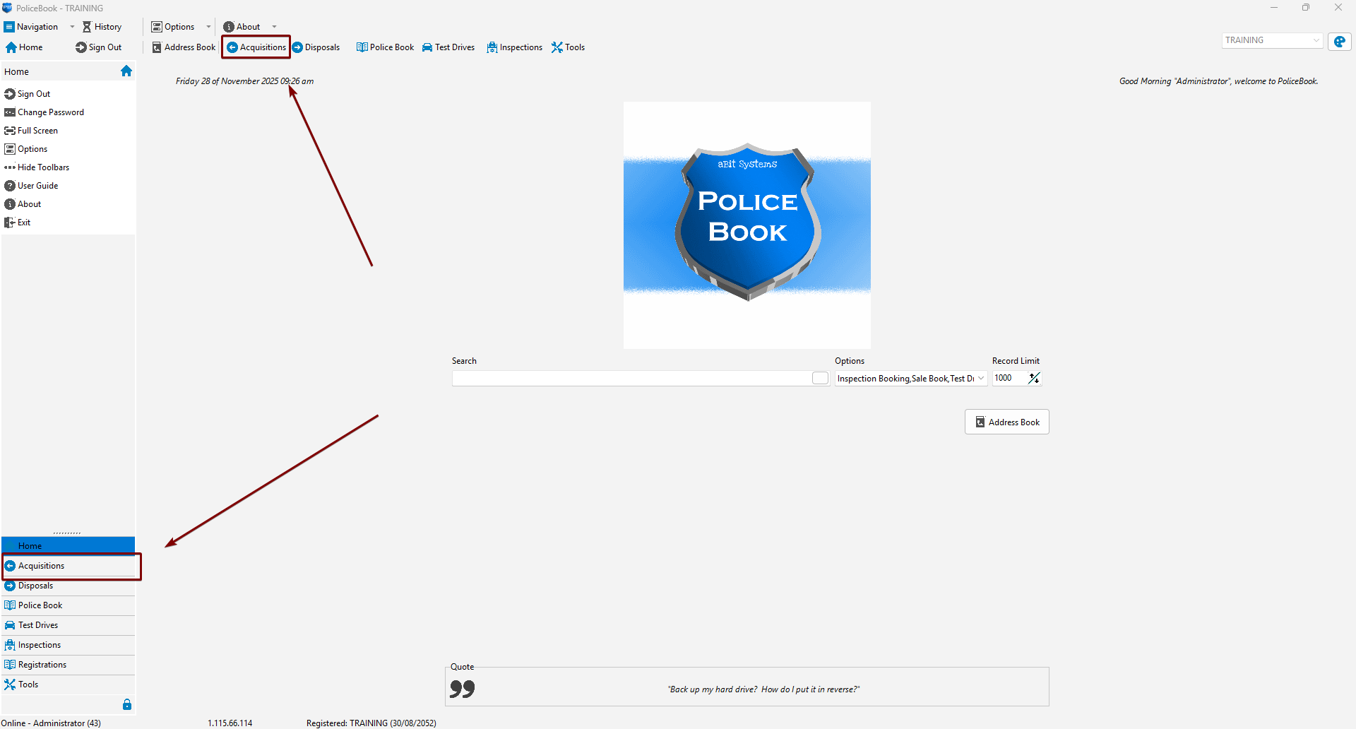 You can access the Acquisitions page by clicking the Acquisitions button in the top toolbar, or the Acquisitions button in the left-side navigation menu. You can also view Acquisitions and Disposals together with the "Police Book" button.