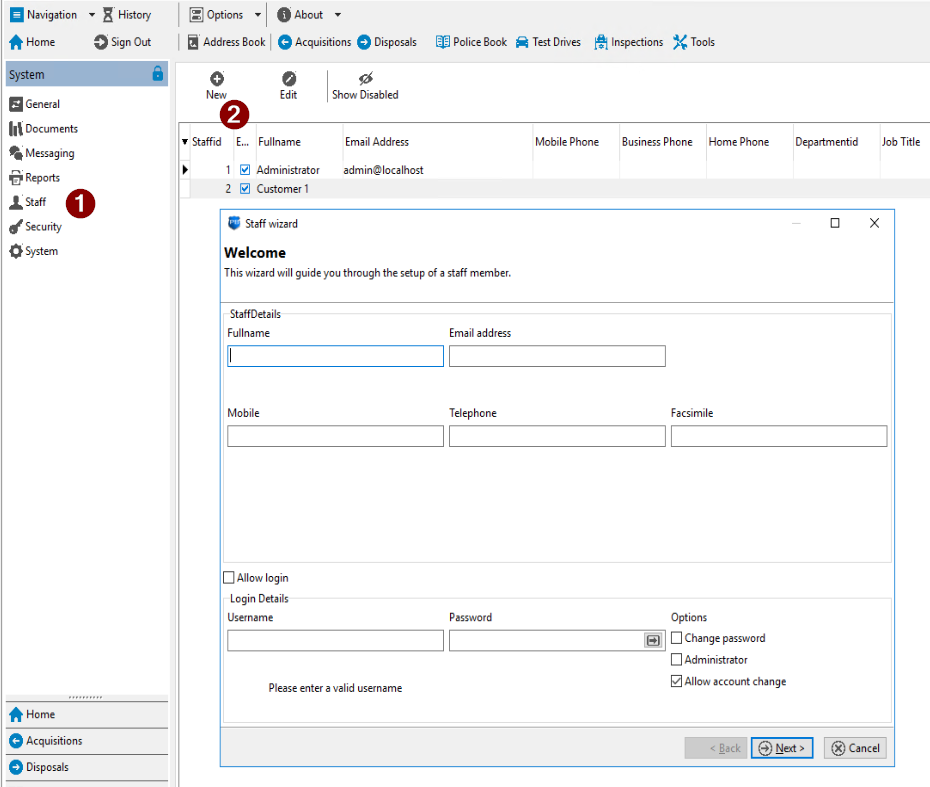 Start the new staff wizard, enter required information if the user is required to login check the "Allow login" box