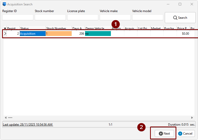 You will need to choose an Acquisition to dispose. Once you have found your Acquisition to dispose, click "Next". Make sure that it is the right vehicle to dispose.