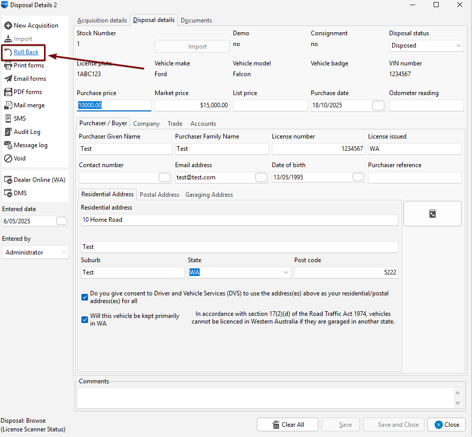 If the sale has fallen through, you can roll back a disposal, returning it back into Acquisitions. You can roll back by editing the entry and clicking the "Roll back" button.