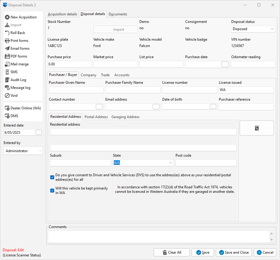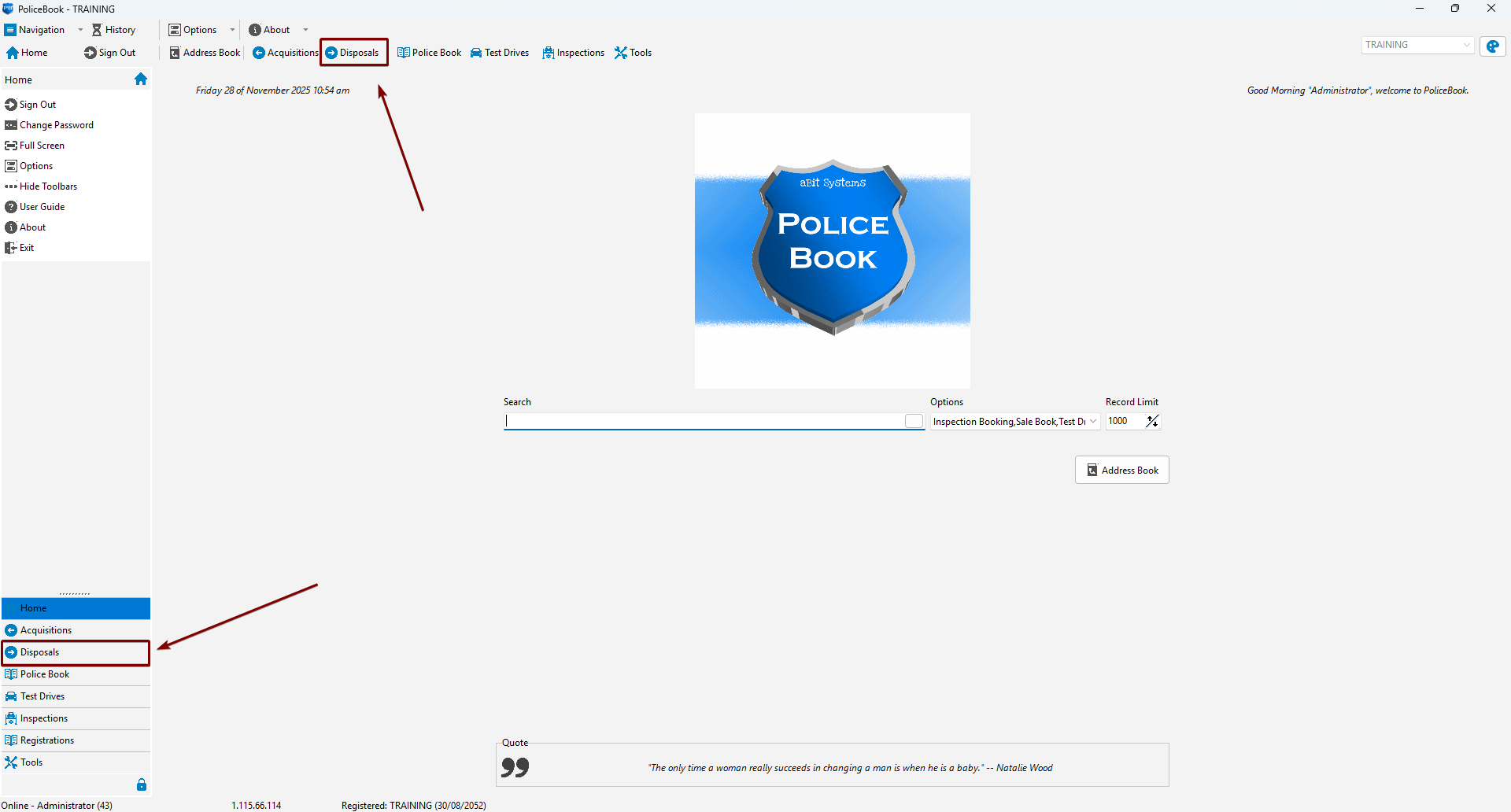 You can access the Disposals page by clicking the Disposals button in the top toolbar, or the Disposals button in the left-side navigation menu. You can also view Acquisitions and Disposals together with the "Police Book" button.