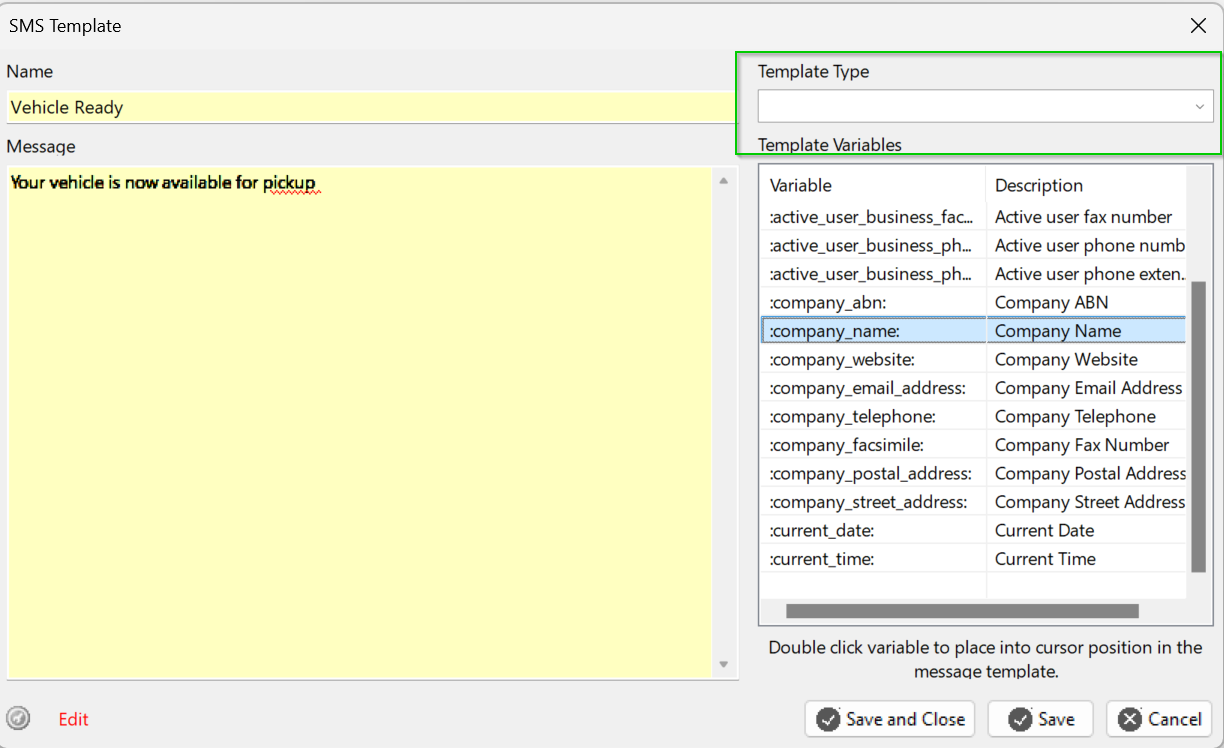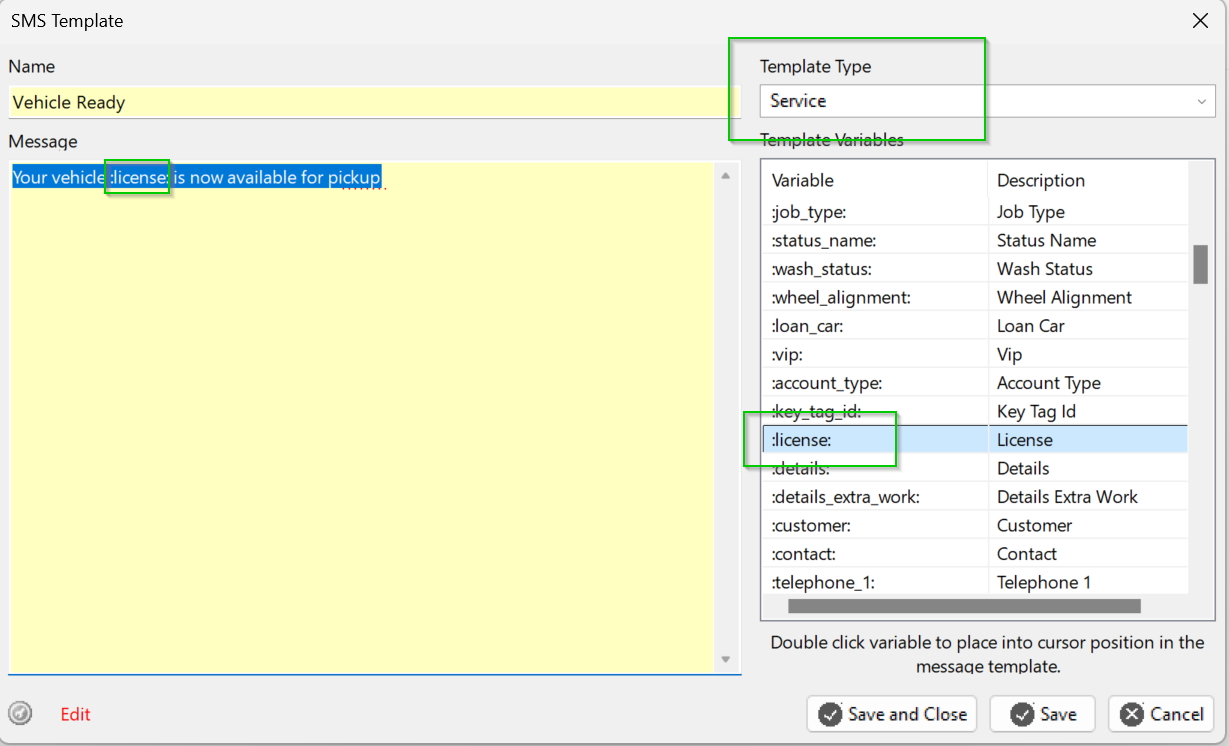 An SMS template can include data related to the module you are sending it from. For example a service job could use the field :license: to send a message that include the vehicle registration.